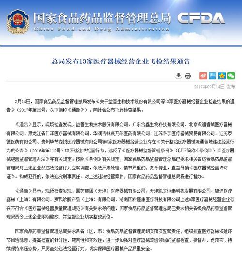 2月14日,国家食品药品监督管理总局发布《关于益善生物技术股份有限公司等13家医疗器械经营企业检查结果的通告》(2017年第22号,以下简称《通告》),向社会公布飞行检查结果。