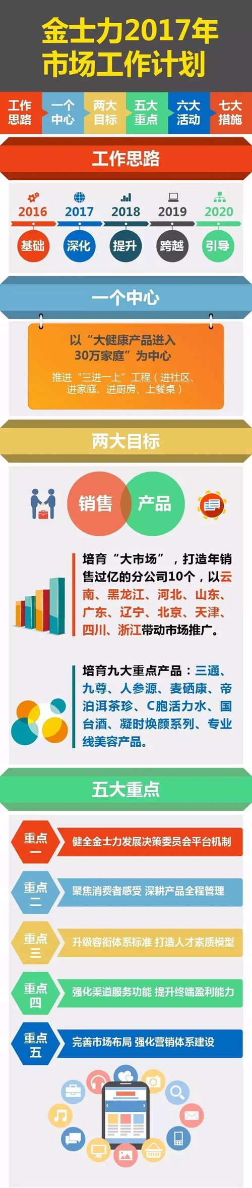 其中,金士力佳友以大健康产品进入30万家庭为中心;销售、产品为两大目标;健全金士力发展决策委员会平台机制,聚焦消费者感受、深耕产品全程管理,升级容衔体系标准、打造人才素质模型,强化渠道服务功能、提升终端盈利能力,完善市场布局、强化营销体系建设为五大重点;以大健康中国行、蘭馨薈、大健康环球筑梦之旅泰国站和美国站、金鼎之约、金鹰盛会为六大活动;以扩大产品宣传、升级品牌活动,优化组织结构、打造骨干团队,深挖产品价值内涵、打造大产品梯队,用大健康教育统领思想、目标高度一致,推出激励政策、助力市场发展,升级服务标准、提升营运效率,把握市场主线、扩宽发展路径为七大举措。对2017年市场工作,进行了全面部署。