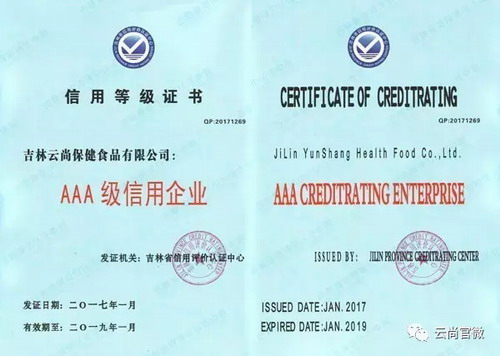吉林云尚保健食品有限公司以多年来良好的诚信记录,经严格的审核及评级流程,荣获吉林省“AAA级信用企业” 称号并获证书!获此荣誉是对云尚十六年来坚守重诺守信、诚信为本的经营理念之高度认可,更是代表了吉林省政府及民众对于云尚持续发展壮大的殷切期望!
