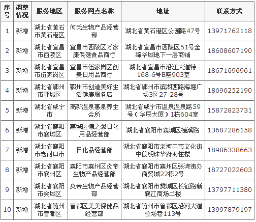 2017年3月13日,商务部直销行业管理信息系统网站公示湖南炎帝生物工程有限公司调整服务网点信息。炎帝此次新增湖北省10个服务网点。详情如下: