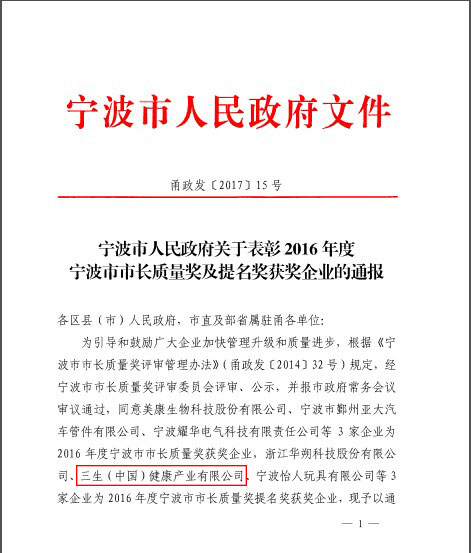 代表宁波市质量管理领域最高荣誉的2016年度市长质量奖近日揭晓,三生(中国)荣获2016年度宁波市市长质量奖提名奖。