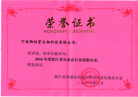 御坊堂被评为2016年度浙江省化妆品行业创新企业