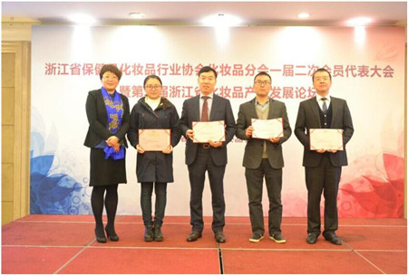 3月20日,浙江省保健品化妆品行业协会化妆品分会一届二次会员代表大会暨第二届浙江省化妆品产业发展论坛在杭州举办,宁波御坊堂生物科技有限公司被评为2016年度浙江省化妆品行业创新企业,研发技术副总经理贾福怀先生被聘为协会化妆品分会第一届专家委员会专家委员,研发技术部注册主管许璐云被评为先进个人。
