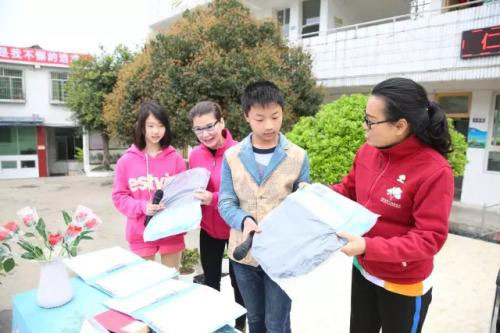 周健副理事长、志愿者代表季梅为学生们发放学习用品