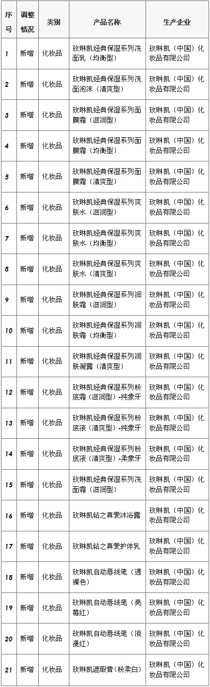 2017年3月22日,商务部直销行业管理信息系统网站公示玫琳凯(中国)化妆品有限公司调整直销产品信息。玫琳凯此次新增化妆品21款,详细信息如下: