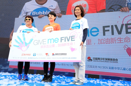 在活动现场,参与者用‘Give Me Five’的特殊方法进行跑步接力。据介绍,之所以用‘Give ME Five’作为接力棒,不仅是活动形式上的创意,更是本届活动对如新“预见更好的自己”的品牌理念的深化和演绎。同时,活动的五个赛道基站将被喷出白色、绿色、橙色、粉色和蓝色的泡泡,而这五种颜色也分别代表NU SKIN如新纯然无瑕的产品理念、积极乐活的健康理念、乐善奉献的公益理念、GO GREEN的环保理念以及坚持梦想的成功理念。用青春、阳光、多彩、健康、丰富的五位一体新元素,让‘Give Me Five’预见更好的自己的品牌口号深入人心。