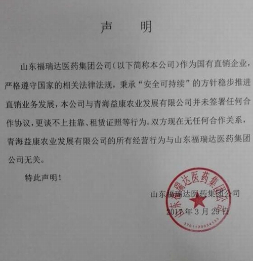 山东福瑞达医药集团公司(以下简称本公司)作为国有直销企业,严格遵守国家的相关法律法规,秉承“安全可持续”的方针稳步推进直销业务发展,本公司与青海益康农业发展有限公司并未签署任何合作协议,更谈不上挂靠、租赁证照等行为。双方现在无任何合作关系,青海益康农业发展有限公司的所有经营行为与山东福瑞达医药集团公司无关。