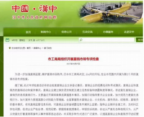 为进一步加强直销监管,维护直销市场秩序,汉中市工商局决定,从4月初开始,在该市全市范围内开展为期2个月的直销市场专项检查。