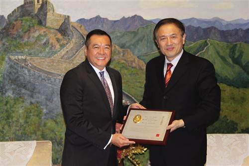 国家外国专家局副局长陆明向玫琳凯公司亚太区总裁蔡庆国先生颁发“马可·波罗奖”
