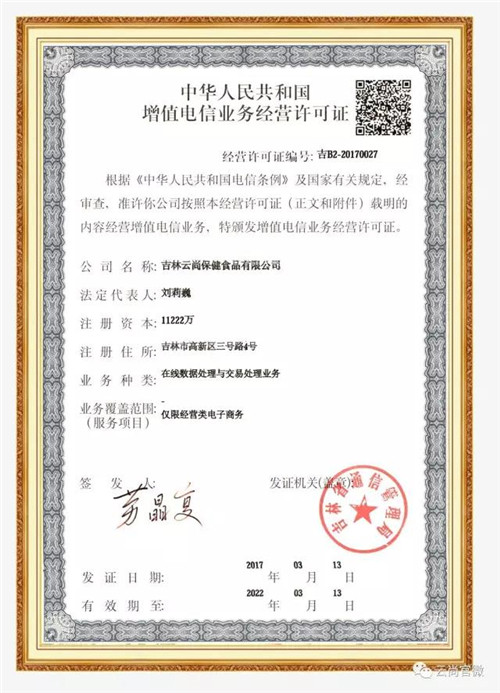 4月13日,吉林云尚保健食品有限公司获得吉林省通信管理局颁发的增值电信业务经营许可证(EDI证),成为中国为数不多的获取增值电信业务经营许可的企业之一!