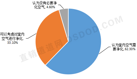 首先,从空气净化器的市场需求来看,空气净化器市场呈现井喷式增长。有调查结果显示,有超过九成的消费者有净化室内空气的需求,其中62.3%的消费者认为室内空气需要净化;33.1%的消费者觉得可以考虑对室内空气进行净化;仅有4.6%的消费者认为没有必要净化空气。