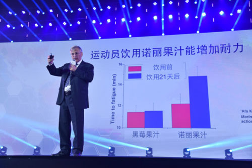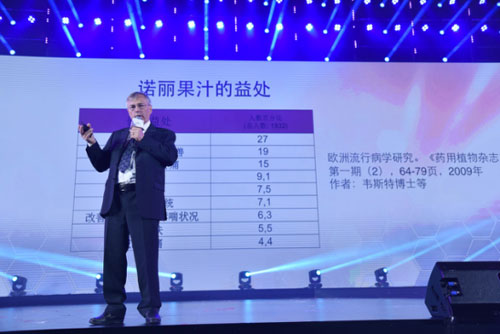 德国汉堡大学医学院毒理学创始人、教授,欧盟食品安全评估委员会委员约翰内斯·维森多夫博士做了专业演讲。他说,经过多年对于诺丽果汁的研究,证实了波利尼西亚人所记载的饮用诺丽果汁后对于健康益处的改善,例如:饮用诺丽果汁可以抵抗老化因子AGEs在体内的形成;可以增强体能和耐力;可以增强人体免疫力,抵抗外界侵害、减少感染;可以减轻疼痛;可以帮助糖尿病人改善健康状况。