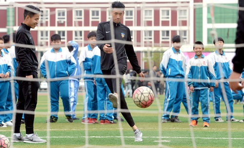 奥运冠军、权健足球运动员与孩子们一起做运动