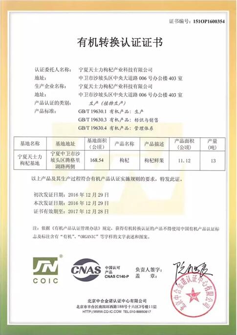 中国枸杞种植历史源远流长,宁夏作为中国优质枸杞的道地产区拥有得天独厚的发展优势。2015年2月13日,秉承“追求天人合一,提高生命质量”的理念、以实现大健康产业发展为目标的天士力人,在宁夏中卫腾格里湖畔采用有机生产方式,建成占地面积5000余亩的有机枸杞庄园,枸杞产品通过576项农残检测,均为零农残,并先后通过中国一级良好农业规范(GAP+)认证、欧盟有机枸杞转换认证、中国有机枸杞转换认证,以最优品质进入市场。