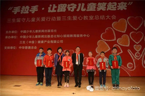 2015年10月,三生留守儿童关爱行动项目总结大会,黄金宝先生和留守儿童代表在一起。