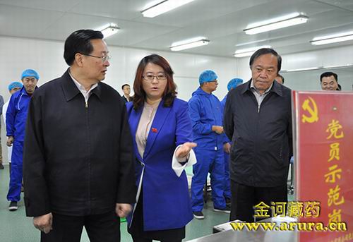王国生书记一行在金诃藏医药集团多杰董事长、金诃藏药牛豫娟执行总裁、俞瑞华副总裁、金诃藏药工会班玛才仁主席的陪同下,深入公司颗粒车间生产一线,调研颗粒内外包全自动化生产线,王书记对金诃藏药独家产品安儿宁颗粒实现全自动化生产线给予了高度的评价,并鼓励企业注重科技运用、创新发展藏药产业事业,并与一线员工进行了亲切的谈话,希望广大员工以劳模为楷模,恪尽职守、努力工作。