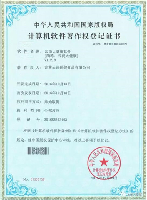 为与时俱进,掌握核心科技,云尚成为国家级研发合作机构——中国食品发酵工业研究院A级战略合作单位、国家新食品资源健康产业技术创新战略联盟成员等;“云尚大健康软件”荣获国家著作权证书,并纳入国家重点项目库;2017年4月,云尚荣获国家EID许可证。