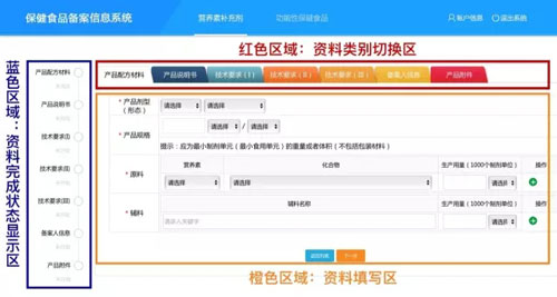 如图所示,资料填报页共分三大部分:上方红色区域为「资料类别切换区」,左侧蓝色区域为「资料完成状态显示区」,中部橙色区域为「备案产品资料填写区」,三处区域分工明确。