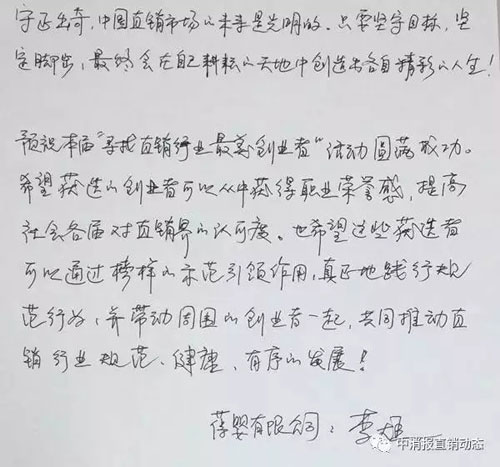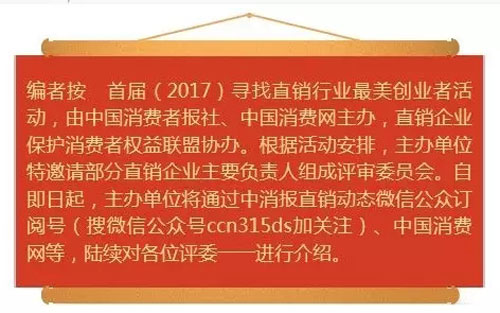 首届(2017)寻找直销行业最美创业者活动,由中国消费者报社、中国消费网主办,直销企业保护消费者权益联盟协办。活动报名时间自即日起到6月30日结束。最终结果将在今年9月底前揭晓。该活动旨在进一步提升直销营销人员的职业荣誉感,提高社会各界对直销行业的认可程度,通过榜样的示范引领作用,推动直销行业规范健康有序发展。