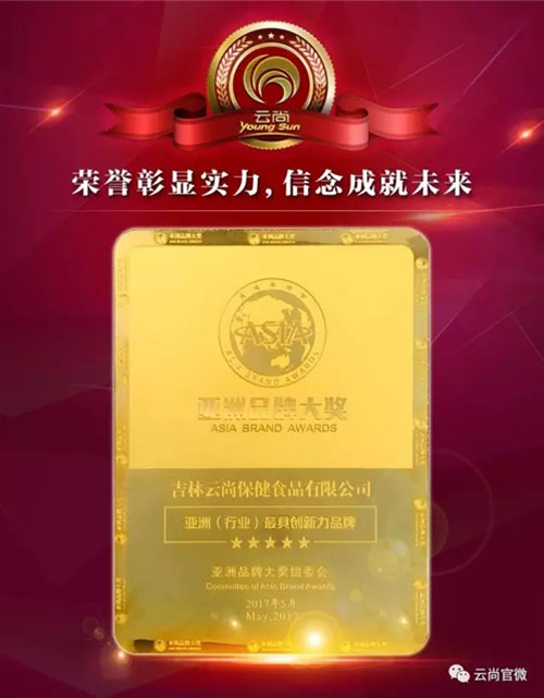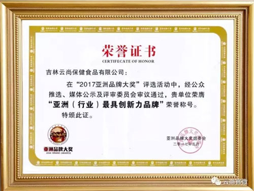 吉林云尚保健食品有限公司凭借良好的品牌口碑及影响力,在“2017亚洲品牌大奖”评选活动中,通过层层审议,荣膺“亚洲(行业)最具创新力品牌”荣誉称号。