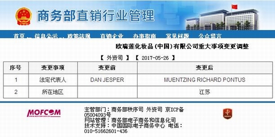 5月26日,商务部直销行业信息管理系统网站发布欧瑞莲化妆品(中国)有限公司重大事项变更调整信息。欧瑞莲法定代表人由DAN JESPER变更为MUENTZING RICHARD PONTUS;所在地区变更为江苏。详情如下: