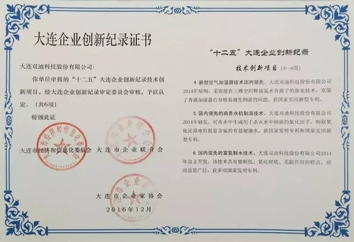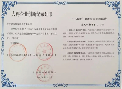 经大连市经济和信息化委员会、大连市企业联合会、大连市企业家协会三方(即大连企业创新纪录审定委员会)审核认定,双迪股份富氢制水技术、果蔬清洗机、健康饮水机、新型空气加湿器技术、商务水机制造技术、电解水杯技术六大技术被列为“十二五”大连企业创新记录技术创新项目。