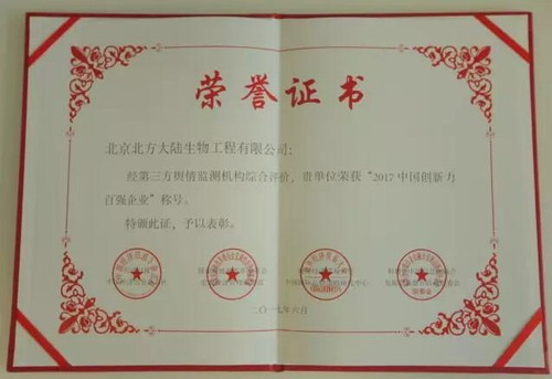 北方大陆荣获“2017中国创新力百强企业”荣誉称号