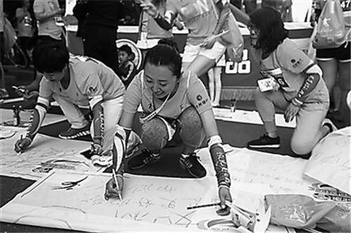 在NU SKIN如新方阵中还有这样一道风景线,热身前参赛者们都低头挥动画笔现场彩绘,每个人都在旗子上画出了心中的兰马。起跑鸣枪后,这些“画家”们挥舞着自己的旗子向前奔跑,他们画出的五彩兰马图随风飘扬,成为兰马赛道上一道独特的风景。