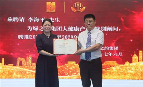 绿之韵集团董事、总裁劳嘉为绿之韵大健康产业特别顾问李海平颁发特聘证书