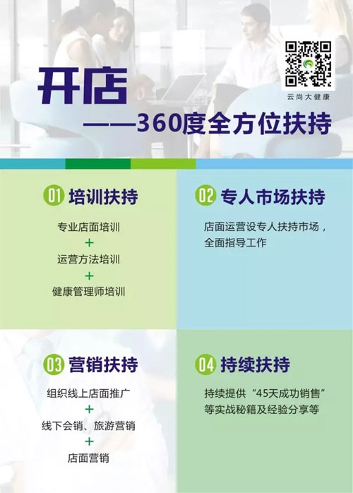 云尚健康调理中心通过发挥自身的“全程性、突破性、便捷性、专业化、精准化、特色化”六大核心优势,全面打造“千城万店”品牌形象效应。其雄厚的经济实力,成熟的运管模式,为广大创业者提供最优质的创业平台,让加盟者开店经营无忧,实现财富梦想!