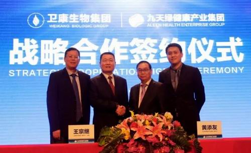 6月17日,卫康生物集团与九天绿健康产业集团在广东签署战略合作协议,卫康生物集团董事长、总裁王宗继先生,九天绿健康产业集团董事长黄添友先生等出席签约仪式。