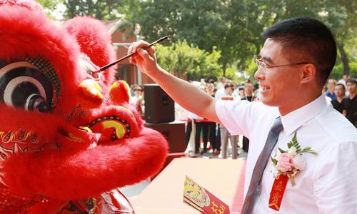 张总为睡狮点睛,预示太阳神事业蒸蒸日上,财源滚滚。
