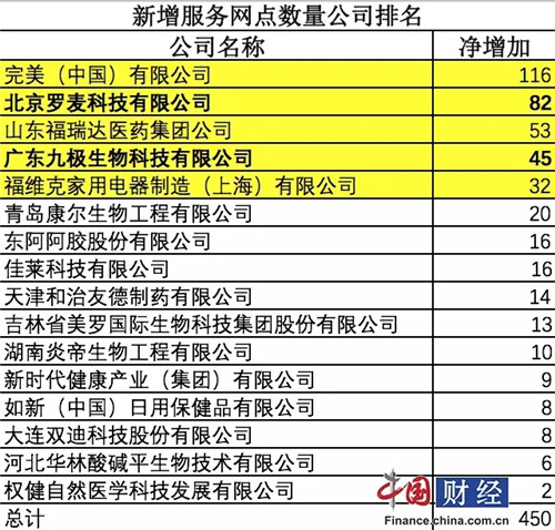 截至6月15日,完美(中国)公司在甘肃省、宁夏省、青海省、海南省、浙江省等共5省增设了116家服务网点。权健公司在四川省、北京市、河北省、广东省、江苏省、山东省、辽宁省、湖南省、浙江省等共9省市新开设了分公司,并新增服务网点2个。