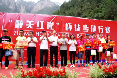 随后,在裁判员的一声号令下,1000余名活动参与者按照队列顺序逐一登台打卡,开始整个赛程。本次健步行活动起点设在红崖峡谷游客服务中心,终点位于太岳山最高峰——牛角鞍,全程约12公里。活动进行过程中,近150名大健康中国行志愿者发扬拼搏向上的进取精神,勇于争先,展现了良好的精神风貌,同时大家也将团队精神展现的淋漓尽致,全程互帮互助,鼓劲加油,同心协力往前冲。最终,经过激励角逐,大健康中国行志愿者田武斌、田茂、张玉生等在千余名活动参与者中脱颖而出,喜获三等奖、优秀奖等奖项。