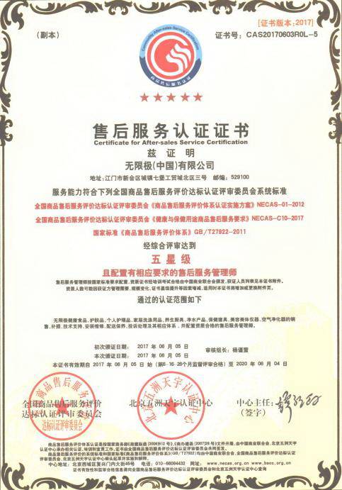 日前,无限极经过国家商务部独家授权、国家认监委批准成立的北京五洲天宇认证中心严格检阅,摘下了国内售后服务认证中的最高评级——五星级售后服务认证,成为了直销行业内第一家获此殊荣的企业。