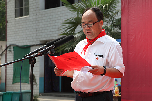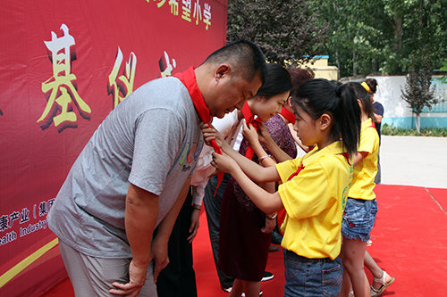 奠基仪式上,少先队员代表为每位嘉宾佩戴了红领巾。随后,叶县县委副书记张文成首先致辞,充分感谢了新时代健康产业集团、北京国珍爱心基金会和仉昊女士对当地教育事业发展的大力支持,新时代人弘扬了中华民族的扶贫济困、助人为乐的传统美德,也将极大地激发社会各界热心公益事业、关注弱势群体、积极捐资助教的热情,并表示会倍加珍惜这次宝贵的爱心捐助,严把工程质量关,让我们的国珍希望小学成为孩子们读书的乐园。