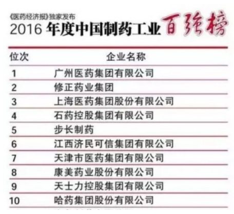 本次百强榜中,广州医药集团有限公司、修正药业集团、上海医药集团股份有限公司、石药控股集团有限公司、步长制药位居榜单的前五名。值得一提的是,修正药业集团再次蝉联榜眼宝座。