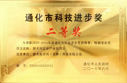 近日,在吉林省通化市举行的“2015-2016年度通化市科技进步奖”表彰大会上,康美新开河“新开河红参产业化项目”获通化市科技进步二等奖。