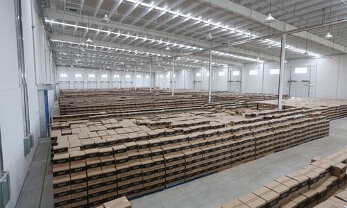 不得不提的,是基地占地近6000平方米的仓库,这里堆放的产品,整齐划一,规范秩序。