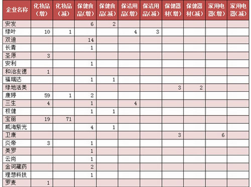 截止2017年6月30日,根据商务部直销行业管理信息系统信息公示,2017年上半年共有21家直销企业进行产品更新,涉及化妆品、保健食品、保洁用品、保健器材、家用电器五大类,共240种产品更新,其中新增产品数量占比65%,减少产品数量占比35%。其中更新频率最高的是化妆品类,其次是保健食品类,详见表2。