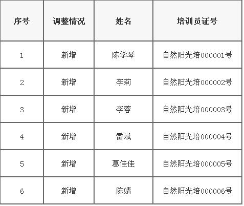 7月20日,商务部直销行业管理信息系统发布自然阳光(上海)日用品有限公司调整直销培训员备案信息。自然阳光此次调整,新增直销培训员6人。详情如下: