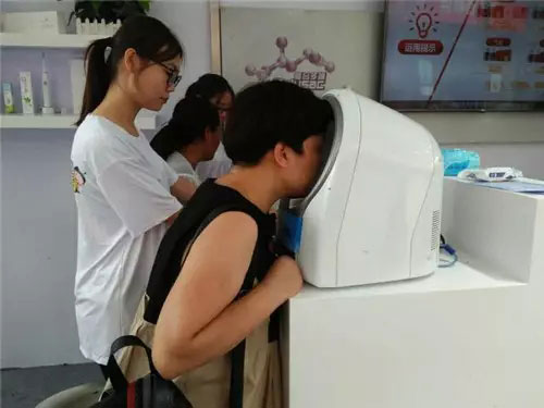 除此之外,现场的皮肤检测器更是爱美女生的“宠儿”,夏季容易心火旺盛,暗疮粉刺成影响皮肤的常见情况。检测者只需要在皮肤检测仪扫上“三眼”,即可洞察皮肤的年龄,还能检测到毛孔、皱纹、粗糙度、色斑等数据,并有专业人员为测试者讲解数据情况。
