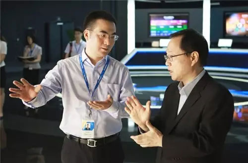 陈朝龙(右)与姚凯(左)在苏宁智慧零售体验区现场交流