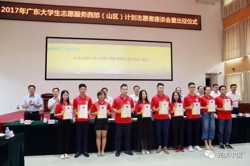 2017年广东大学生志愿服务西部(山区)计划志愿者座谈会暨出征仪式上,往届表现突出的大学生志愿者获颁五星证书。