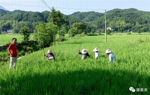 7月23日,余春富董事长和安徽农业大学专家丁克坚教授、李福宝教授专程前往康美来集团云湶谷公司大别山长岭农场,观察高山有机香稻生长情况,50多位农场农民工正在稻田里除草,用人工的方法,拔掉每一颗杂草。董事长说,这种原始方法我们虽然人工成本高,但坚决不用除草剂,严格按有机稻标准生产作业。云湶谷农场是康美来会员自家的农场,确保高品质生产,不打农药,不施化肥,不用除草剂。