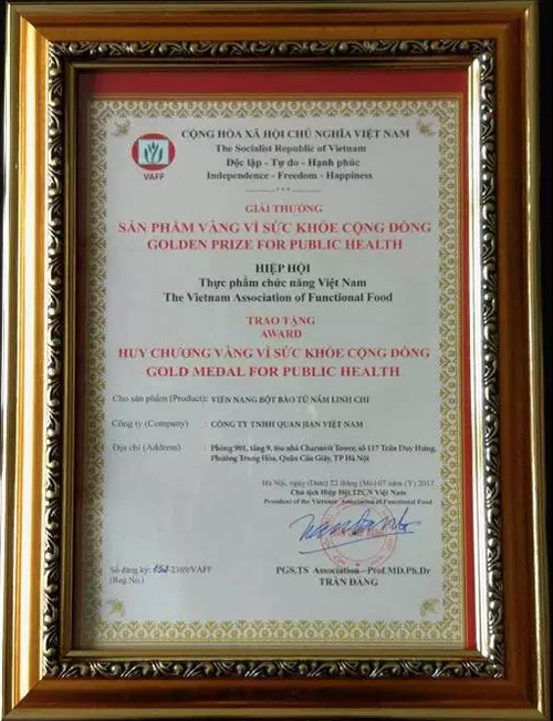 近日,在越南保健食品协会举办的评奖活动,权健牌破壁灵芝孢子粉胶囊和麦香味固体饮料(麦芽精)两款产品脱颖而出,喜获“对人民健康优质产品”金奖。