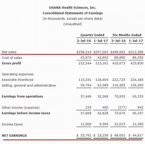2017年上半年,USANA实现销售额5.12亿美元,同比增长2.69%;实现净利润4462万美元,同比下降7.17%。