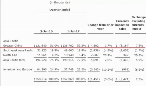 2017第二季度,大中华区实现销售额1.37亿美元,占总销售额的53.2%,扣除汇率因素后同比增长7.6%。公司表示,二季度中国大陆地区活跃消费者增长了9.3%,这是大中华区的业绩增长的主要因素。