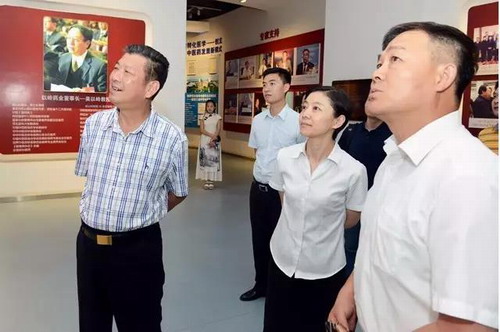 桂林三金药业总裁王许飞(左一),乐仁堂总经理王玉杰(右一)参观以岭药业文化创新展厅
