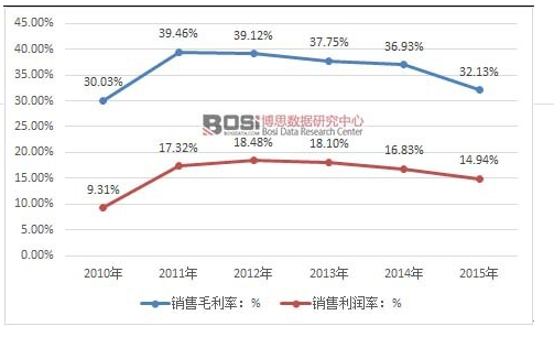 博思数据发布的《2017-2022年中国营养保健品市场投资前景分析及投资前景研究咨询报告》,从行业整体盈利状况来看,2010-2015年,我国营养保健品行业的毛利率均在30%以上,销售利润率总体呈波动态势,2015年为14.94%。